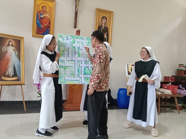 Pada pukul 10.00 WIB kami masuk ke dalam ruang pertemuan komunitas Rawaseneng. Acara-acara telah disiapkan: ada nyanyian, gerak dan lagu, permainan, kuis, dan TTS (Teka Teki Silang) tentu saja masih ditambah pembagian hadiah bagi yang menang dan yang kalah, makan siang bersama, cuci piring bersama dan foto bersama…